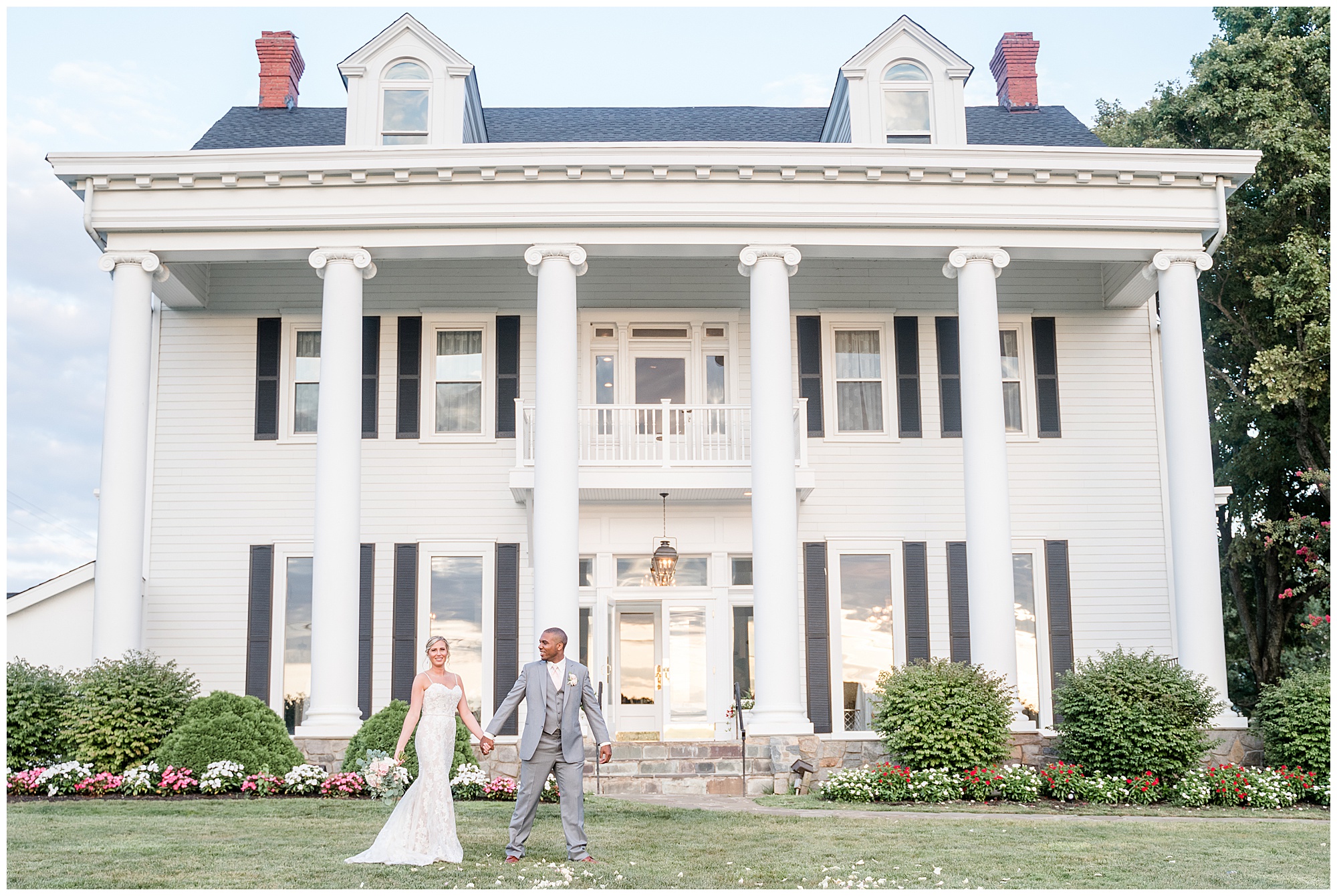 Someone smiled down on Caroline and Greg’s Virginia August wedding. A high of eighty degrees in Virginia in August is unheard of, but the day dawned more autumnal than summery. Weather was just one of the elements that came together to create a gorgeous, classic Bristow Manor wedding. Beautiful event space, lush flowers, hair and makeup and a picture-perfect reception all played a part.