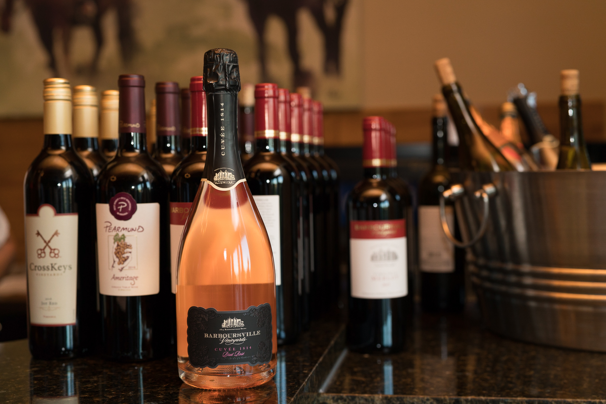 An array of Virginia wines served during a wedding at Hermitage Hill Farm in Waynesboro, Virginia.